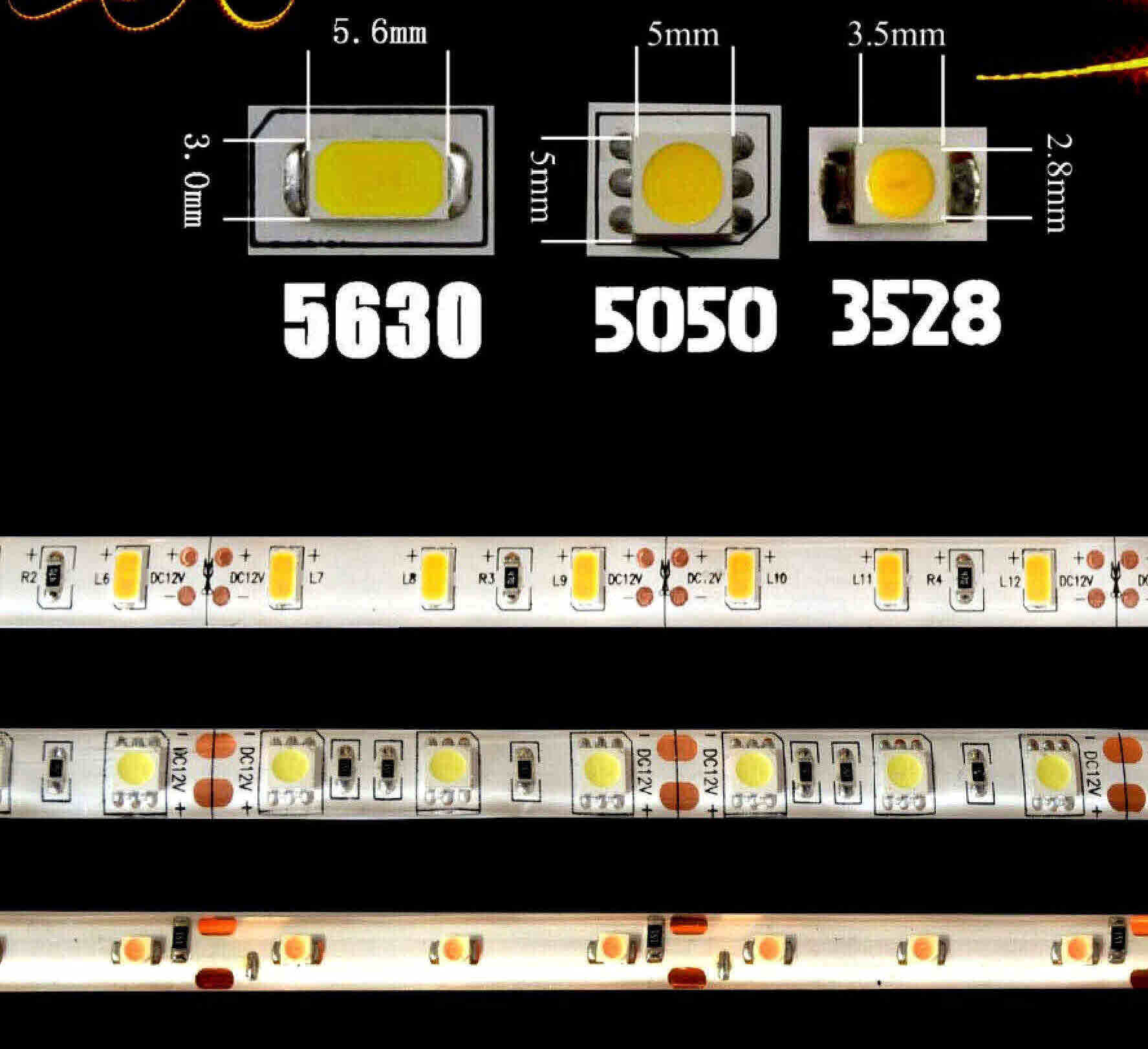 - Specifications for 3528, 5050 and 5630 LEDs including lumens, amp/wattage draw and diode size.